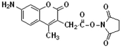 The amine-reactive AMCA, SE (7-amino-4-methylcoumarin-3-acetic acid, succinimidyl ester) and its conjugates yield blue-fluorescence (approximate excitation/emission maxima ~353/442) that can be used as a contrasting color in multicolor applications.