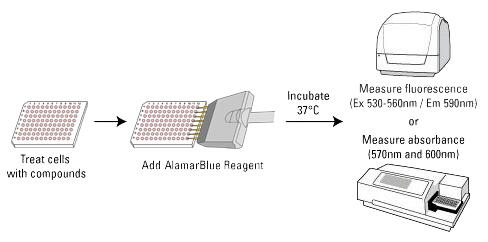 Our Cell-Quant™ AlamarBlue Cell Viability Reagent is a redox indicator that yields a colorimetric change and a fluorescent signal in response to metabolic activity. It is a proven safe and non-toxic dye used for quantitative analysis of cell viability and cell proliferation, for cytokine bioassays and in vitro cytotoxicity studies.