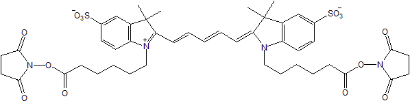 Cy5 is a bright, far-red fluorescent dye. Cy5 Bis NHS Ester contains two reactive groups on each dye molecule. It has been shown to be useful as fluorescent label for biological compounds. Cy5 is intensely fluorescent and highly water soluble.