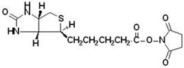 The amine-reactive D-biotin succinimidyl ester can be used to attach this important hapten to biomolecules of interest for subsequent detection with streptavidin, avidin or NeutrAvidin® biotin-binding protein.