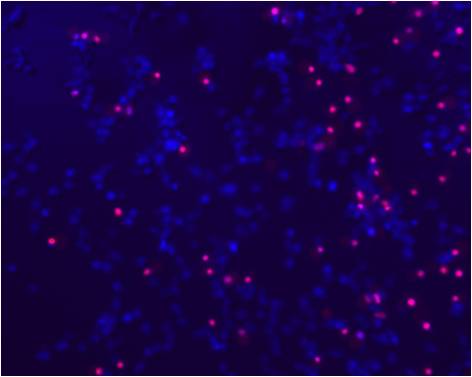 EasyProbes™ Cell Viability Imaging Kit (Blue/Red) is a ready-to-use assay that can quickly and easily determine the viability of cells. Just add 2 drops each of EasyProbes™ Hoechst 33342 Live Cell Stain reagent and EasyProbes™ Propidium Iodide Dead Cell Stain reagent to 1 mL of cell growth media, then determine viability by counting total vs dead cells. EasyProbes™ Hoechst 33342 reagent stains the nuclei of all the cells and can be detected with a standard DAPI filter. EasyProbes™ PI reagent stains only the nuclei of cells with compromised plasma membrane integrity and is detected using a standard TRITC/RFP (orange) filter set. This kit is appropriate for fluorescence microscopy and flow cytometry.