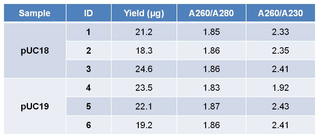 Table 1. DNA yield and quality using ABP EasySC Plasmid Mini Purification Kit