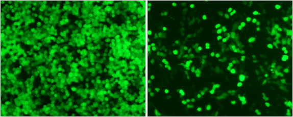 Figure 1. Comparison of Fec293™ and Lipofectamine® 2000 transfection efficiencies using GFP visualization. HEK 293 cells were transfected with a GFP-expressing plasmid using either Fect293™ transfection reagent (left), or Lipofectamine® 2000 (right). Cells were visualized 48 hours post-transfection under fluorescence microscopy (GFP filter).