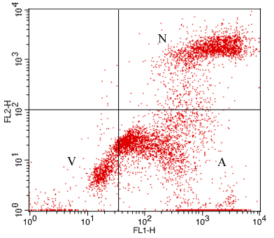 Our FITC Annexin V and PI Apoptosis Kit is used to detect the externalization of phosphatidylserine in apoptotic cells. This kit provides a sensitive two-color assay that employs FITC annexin V and a ready-to-use solution of the red-fluorescent propidium iodide nucleic acid stain.  Propidium iodide is impermeant to live cells and apoptotic cells but stains necrotic cells with red fluorescence, binding tightly to the nucleic acids  in the cell. After staining a cell population with FITC annexin V and propidium iodide in the provided binding buffer, apoptotic cells show green fluorescence, dead cells show red and green fluorescence, and live cells show little or no fluorescence. These populations can easily be distinguished using a flow cytometer with the 488 nm spectral line of an argon-ion laser for excitation.