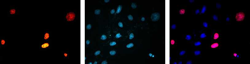 Figure 1. Detection of cell proliferation in cell. A549 cells were treated with 10 µM EdU for 2 hr, then detected with Andy Fluor™ 555 azide (red), cells were counterstained with DAPI (blue).