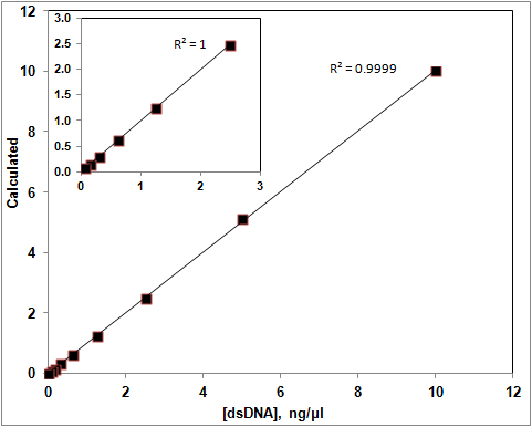 Figure 1. Left: Quantitation of dsDNA with iQuant™ 1X dsDNA HS Assay Kit using fluorescence plate reader. Right: Quantitation of dsDNA with iQuant™ 1X dsDNA HS Assay Kit using Fluorometer.