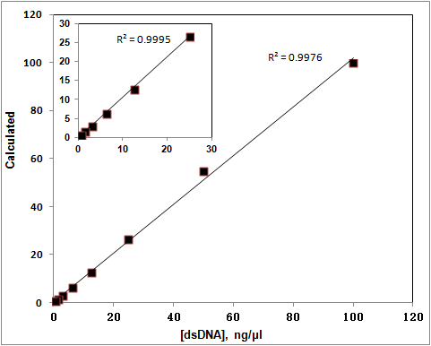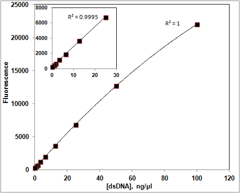 The iQuant™ dsDNA BR Assay Kit is designed specifically for an easy and accurate quantitation of dsDNA. The kit is highly selective for dsDNA over RNA, and offers advantages in stability, linear dynamic range, and sensitivity over other traditional of DNA quantitation. The kit contains concentrated quantitation reagent, dilution buffer, and pre-diluted dsDNA standards. Simply dilute the reagent using the buffer provided, add your sample (any volume between 1 µl and 20 µl is acceptable), and read the fluorescence using fluorescence plate reader or Fluorometer (Figure 1). The assay is well tolerated to common contaminants such as proteins, salts, solvents, detergents, or free nucleotides. The assay can be adapted for use in microplates, tubes or cuvettes.