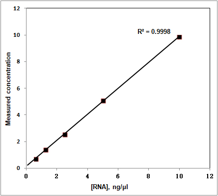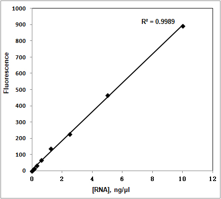 The iQuant™ RNA HS Assay Kit is designed specifically for an easy and accurate quantitation of RNA. The kit is highly selective for RNA in the present of DNA, and offers advantages in stability, linear dynamic range, and sensitivity over other traditional of RNA quantitation. The kit contains concentrated quantitation reagent, dilution buffer, and pre-diluted RNA standards. Simply dilute the reagent using the buffer provided, add your sample (any volume between 1 µl and 20 µl is acceptable), and read the fluorescence using fluorescence plate reader or Fluorometer (Figure 1). The assay is well tolerated to common contaminants such as proteins, salts, solvents, detergents, or free nucleotides. The assay can be adapted for use in microplates, tubes or cuvettes.