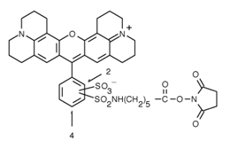 The amine-reactive Sulforhodamine 101-X, succinimidyl ester can be used to create bright red-fluorescent bioconjugates with excitation/emission maxima ~595/615 nm.