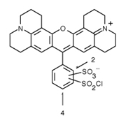 The amine-reactive Sulforhodamine 101 Sulfonyl Chloride can be used to create bright red-fluorescent bioconjugates with excitation/emission maxima ~595/615 nm.