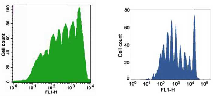 Figure 2. Cell generation analysis with CFSE (Left) and Violet dye (Right). Jurkat cells (~1×106 cells/ml) were stained with CFSE or Violet dye (1 μM) on Day 0. The cells were cultured for 7 days. Fluorescence intensity was measured with FACS flow cytometer.