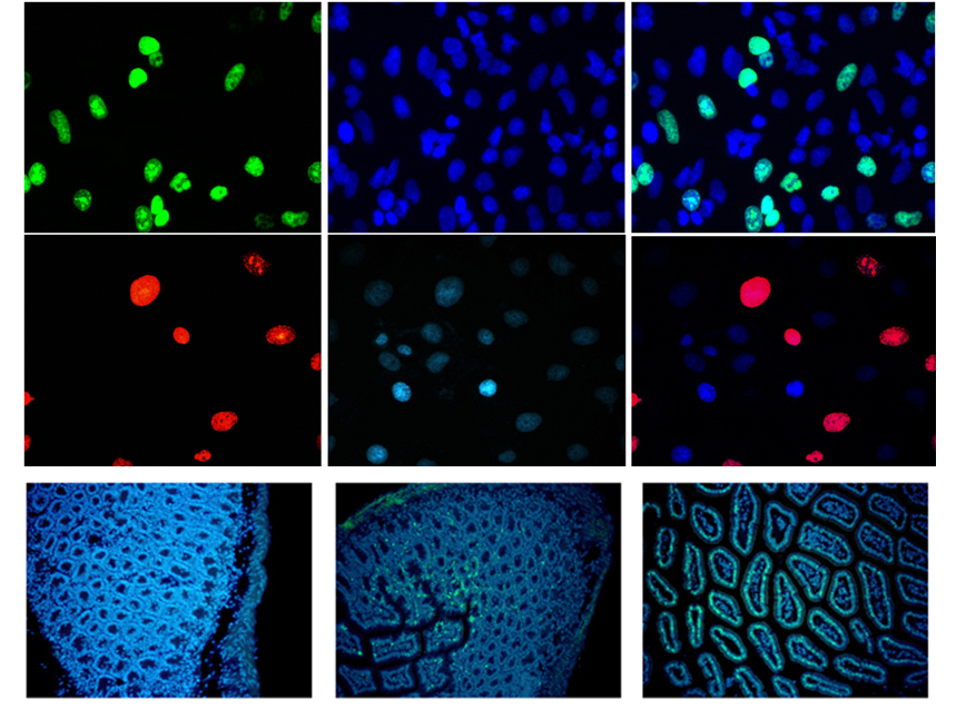 Figure 2. Detection of cell proliferation in cell and mouse tissue. A549 cells were treated with 10 μM EdU for 2 hr, then detected with Andy Fluor™ 488 azide (green, top), and Andy Fluor™ 594 azide (red, middle), cells were counterstained with DAPI (blue). A mouse was injected intraperitoneally with 5 mg EdU per kilogram body weight, then sacrificed at 0, 12, and 24 hr. The mouse intestine tissue was detected with Andy Fluor™ 488 azide (green, bottom), and counterstained with DAPI (blue).