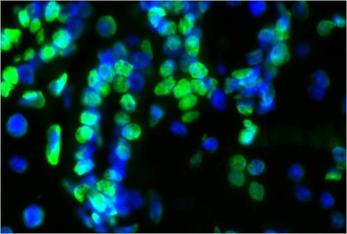 In the TUNEL assay, TdT enzyme catalyzes the addition of labeled dUTP to the 3’ ends of cleaved DNA fragments. Hapten-tagged dUTP (e.g. digoxigenin-dUTP or biotin-dUTP) can be detected using secondary reagents (e.g. anti-digoxigenin antibodies or streptavidin) for fluorescence or colorimetric detection. Alternatively, fluorescent dye-conjugated dUTP can be used for direct detection of fragmented DNA by fluorescence microscopy or flow cytometry. The TUNEL Andy Fluor™ 488 Apoptosis Detection Kit contains dUTP conjugated to biotin and Streptavidin conjugated to bright and photostable Andy Fluor™ 488 green fluorescent dye, for bright fluorescent TUNEL staining.