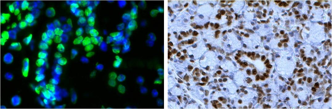 Figure 2. Terminal deoxynucleotidyl transferase dUTP nick end labeling (TUNEL)-mediated detection of apoptotic cells in mouse tongue tissue. The imaging results using TUNEL Andy Fluor™ 488 Apoptosis Detection Kit (left), and TUNEL Chromogenic Apoptosis Detection Kit (right).